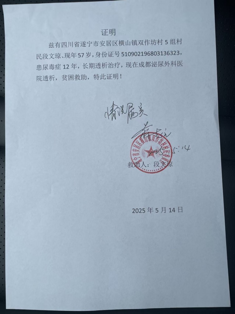 我承诺: 1.我提交至平台的所有医疗材料完全真实 2.我提交至平台的家庭资产等经济情况完全真实 3.我没有任何虚构事实或隐瞒真相的行为 4.我为求助信息的真实性负责,并自愿承担法律责任! 患者姓名:段文琼 日期:2026-02-05